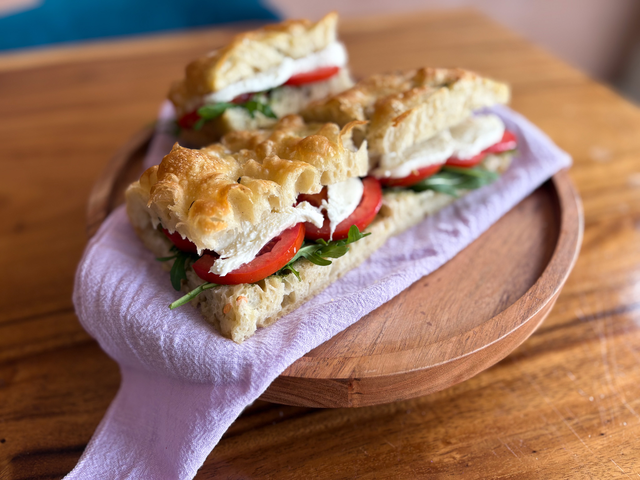 Huisgebakken focaccia belegd met tomaat, verse mozzarella, basilicumpesto en rucola.