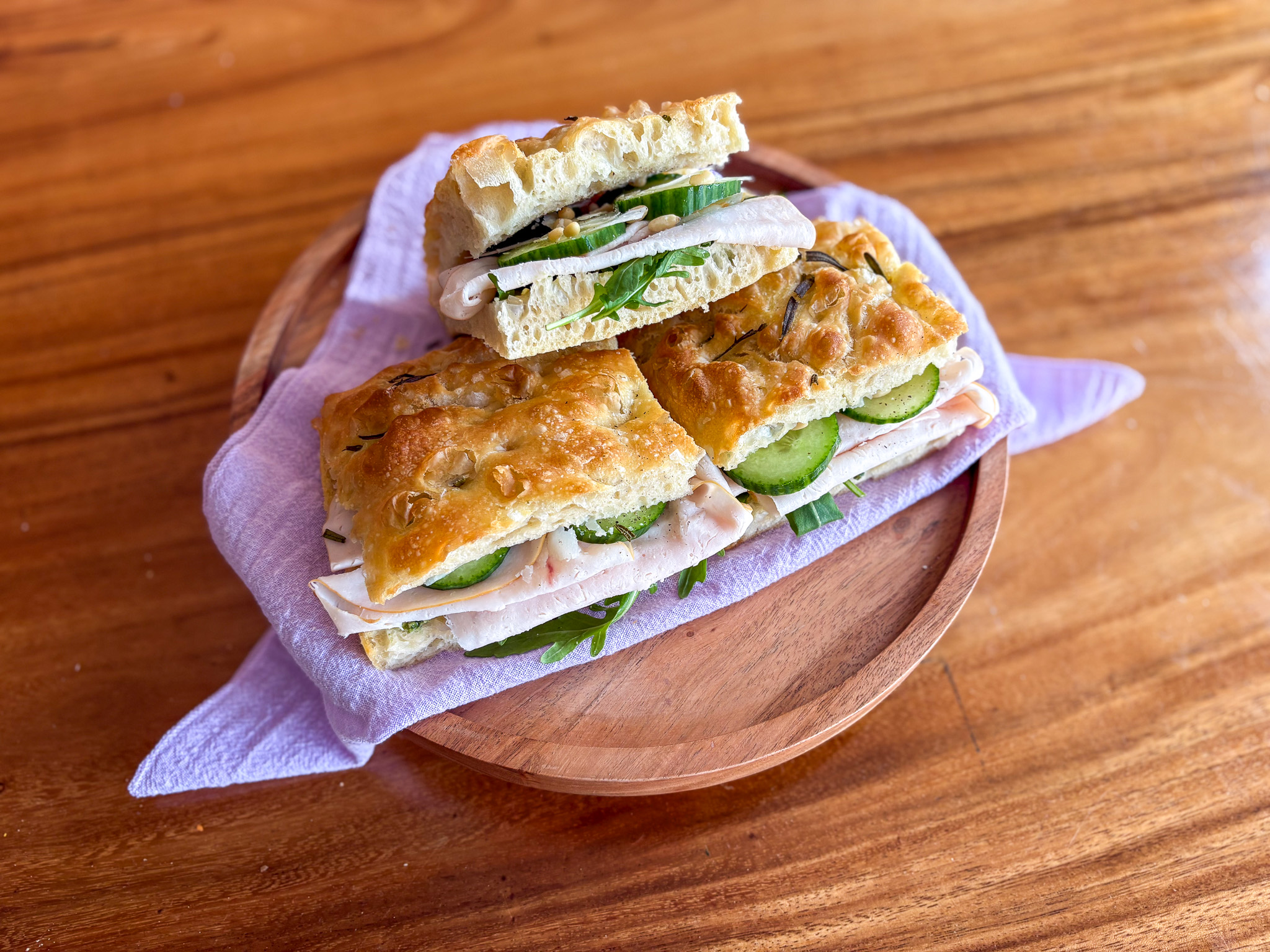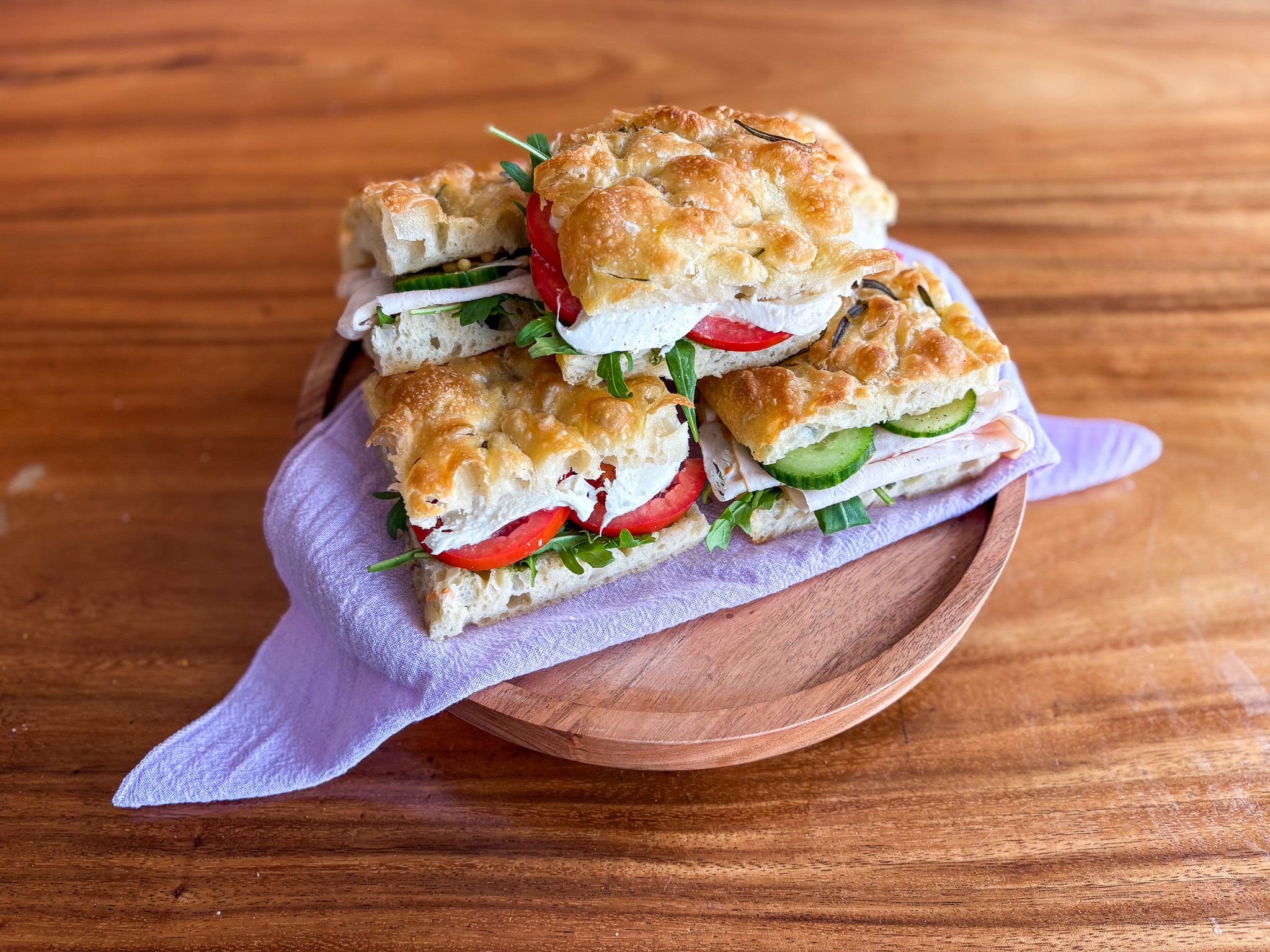 Huisgebakken focaccia belegd met gemarineerde kip, gegrilde paprika en courgette, verse rucola en een romige, huisgemaakte paprikamayonaise.