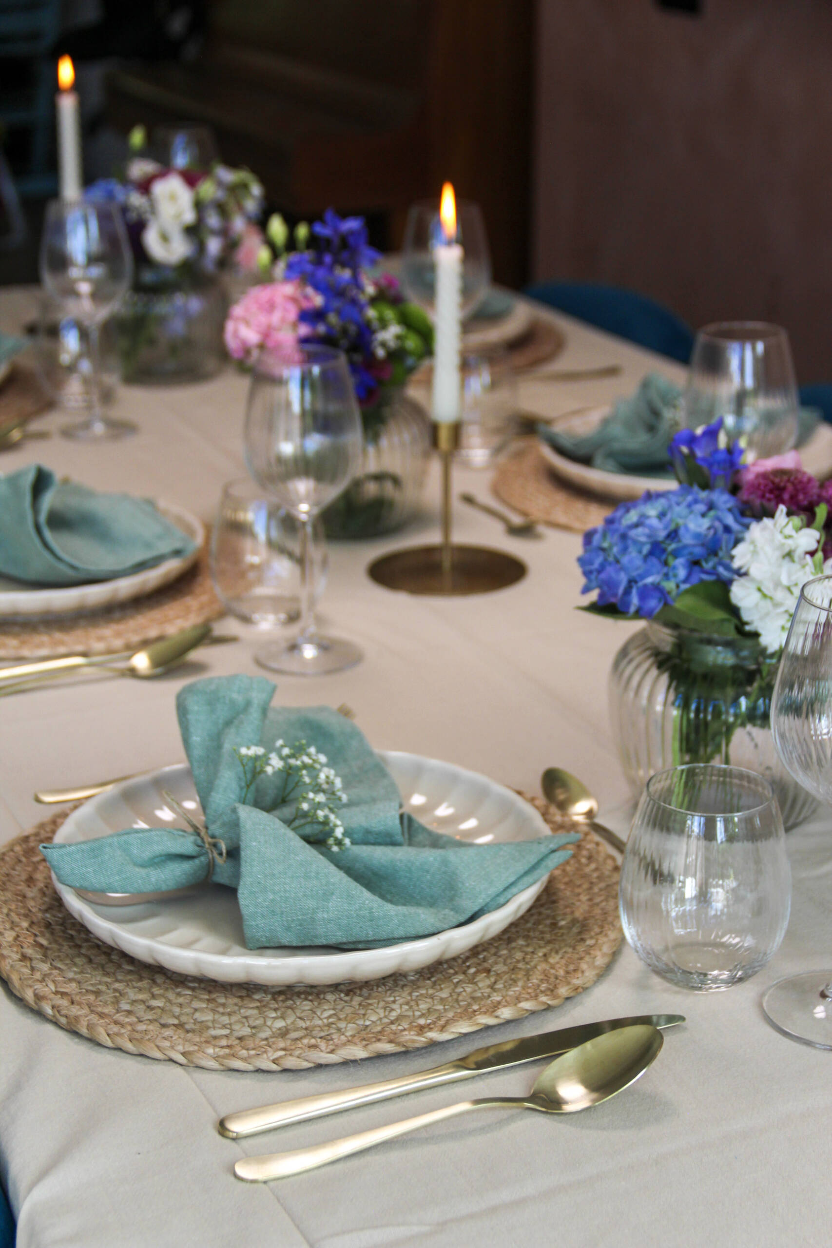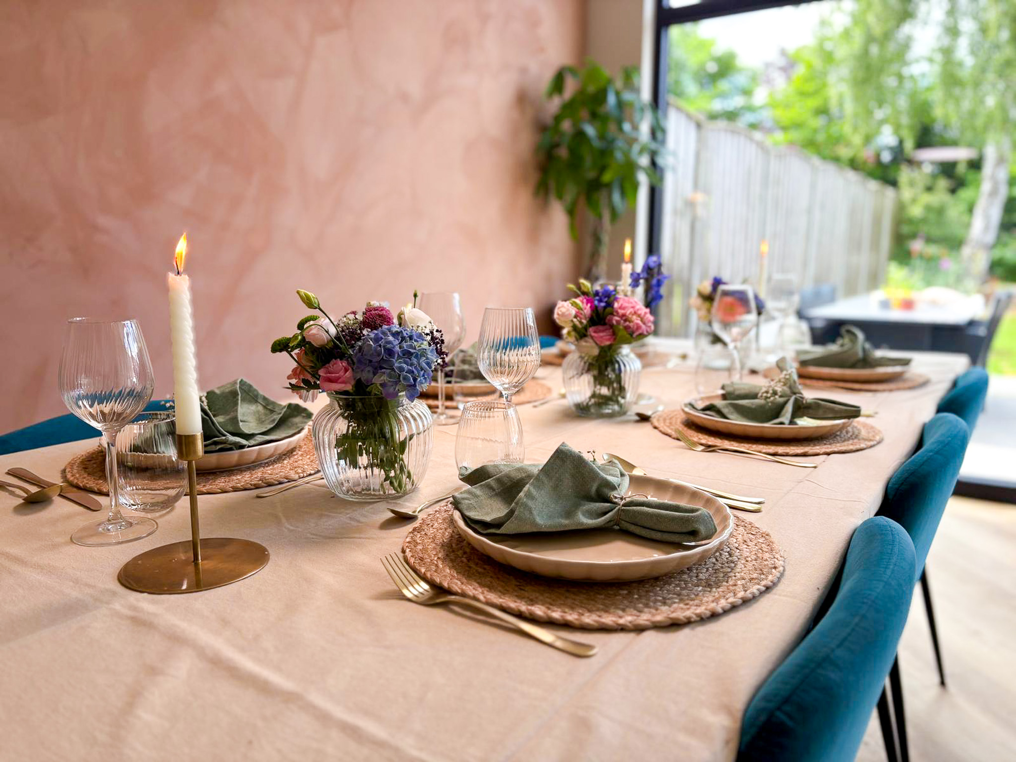 Deze tafel past bij elke gelegenheid die u wilt vieren. of het nu gaat om een gezellig lunch om bij te praten met vrienden of een verjaardag te vieren van een van uw dierbare. De tafel wordt mooi verzorgd met zorgvuldig uitgekozen bestek en servies en verse bloemen.